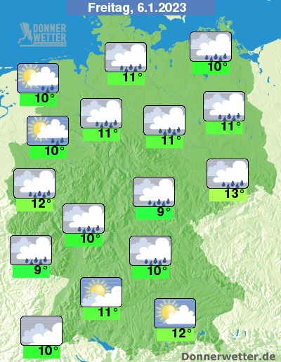 Am Freitag ziehen dichte Wolken durch, dabei bleibt es im Süden trocken, sonst fällt jedoch zeitweise Regen, im Nordosten zum Teil auch Schnee. Die Höchstwerte erreichen 9 Grad im Grabfeld und bis 13 Grad in der Lausitz. Der Wind weht verbreitet stark und teilweise stürmisch.
