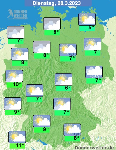 Am Dienstag zeigen sich teils heitere Abschnitte, teilweise ist es aber auch stark bewölkt, dabei bilden sich jedoch nur selten Schauer. Die Temperatur erreicht 5 Grad in Stralsund und bis 11 Grad in Freiburg.