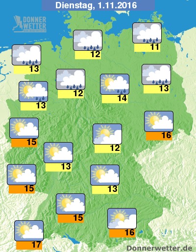 Am Dienstag ziehen im Norden von Norden her dichte Regenwolken auf, die sich im Tagesverlauf etwa bis zur Mitte des Landes hin ausbreiten. Weiter nach Süden bleibt es bei teils aufgelockerter, teils auch schon starker Bewölkung weitgehend trocken. Die Werte erreichen milde 12 bis 17 Grad.