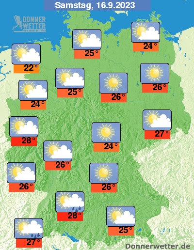 Am Samstag ist es zumeist heiter oder sonnig und dabei trocken. Im Südwesten können allerdings zum Teil einige und auch dichte Wolken aufziehen, dabei sind vereinzelte Schauer möglich. Die Temperatur steigt auf 22 Grad in Wilhelmshaven und bis 28 Grad in Stuttgart.
