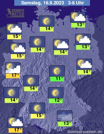 In der Nacht zum Samstag zeigt sich der Himmel sternenklar oder leicht bewölkt. Es bleibt überall trocken bei Tiefstwerten von 17 Grad in Köln und 11 Grad in Jena.