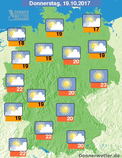 Heute Abend bleibt es von der breiten Landesmitte bis nach Süddeutschland meist sonnig und nur hier und da auch locker bewölkt, im Norden ist es meist leicht bis wechselnd bewölkt, jedoch ebenfalls trocken. Die Temperatur liegt bei 16 Grad in Emden und bis 23 Grad in Freiburg.