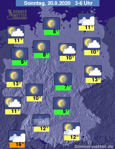 In der Nacht zum Sonntag bleibt es am Oberrhein und im äußeren Nordosten Deutschlands wolkenverhangen, jedoch weitgehend trocken. Im übrigen Land ist es meist sternenklar oder es ziehen nur lockere, teils auch aufgelockerte Wolken durch, dazu bleibt es trocken. Die Temperatur sinkt auf 16 Grad im Breisgau und bis etwa 7 Grad im Eichsfeld.