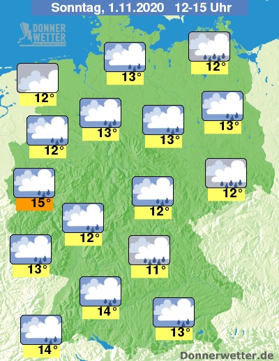 Heute Nachmittag ziehen verbreitet dichte Wolken übers Land hinweg, dabei fällt wiederholt Regen. Die Temperatur steigt auf 12 Grad in Vorpommern und etwa 15 Grad im Rheinland. An der Nordsee und in den Hochlagen der norddeutschen Mittelgebirge weht zudem ein oft stürmischer Wind.
