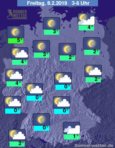 In der Nacht zeigt sich der Himmel meist locker bewölkt, über der Nordhälfte sowie dem Schwarzwald kann es im Verlauf auch aufklaren. Dichtere Wolken halten sich meist nur an den Alpen sowie zeitweise über dem Erzgebirge. Es bleibt meist trocken, kräftigere Schauer sind nur im Alpenvorland zu erwarten.