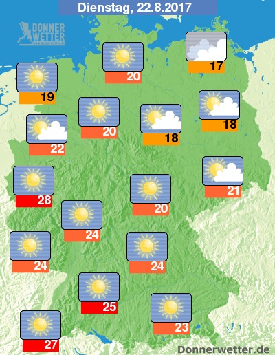 Im Nordosten halten sich zunächst noch dichtere Wolkenfelder, Regen fällt allerdings kaum noch. Mit 17 bis 21 Grad bleibt es hier recht kühl. An der Ostsee weht zum Teil eine frische Brise.
