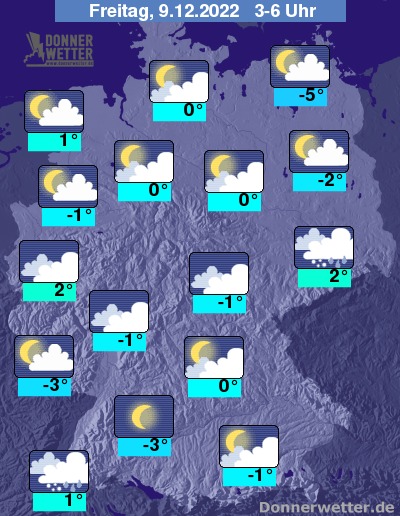 In der Nacht auf Freitag ist es meist locker oder aufgelockert, vor allem von der Eifel über die Landesmitte bis in die Sächsische Schweiz auch häufig stark bewölkt oder bedeckt. Es bleibt zunächst häufig trocken, in den frühen Morgenstunden ziehen von der Schweiz her dann neue Niederschlagsgebiete heran, die dem Südwesten leichten Schneefall bringen können.