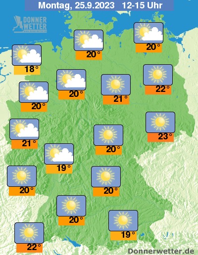 Heute Nachmittag zeigt sich die Sonne von eimem wolkenlosen oder nur gering bewölktem Himmel. Etwas mehr Wolken sind im Nordwesten möglich, aber auch hier bleibt es trocken. Die Temperatur liegt bei 18 Grad an der Nordsee und 23 Grad in der Lausitz.