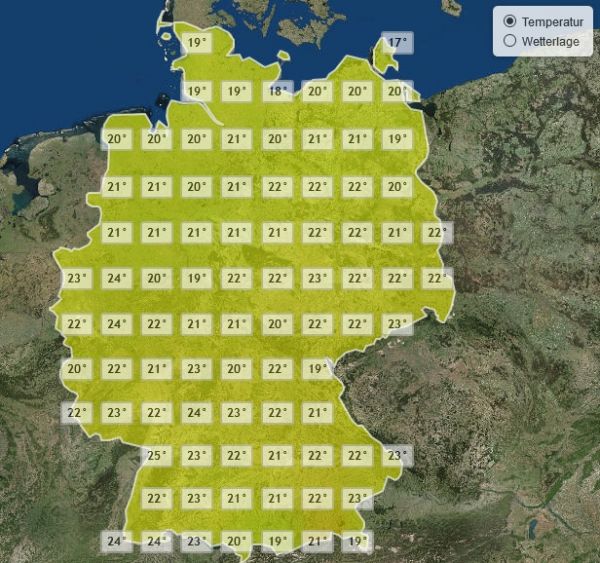 Dazu wird es im ganzen Land noch einmal angenehm mild. Nur auf Rügen bleibt es mit Höchstwerten um die 17 Grad noch recht frisch, sonst reicht es fast landesweit für 20 Grad und mehr. Entlang des Oberrheins sind sogar noch einmal bis zu 25 Grad möglich.