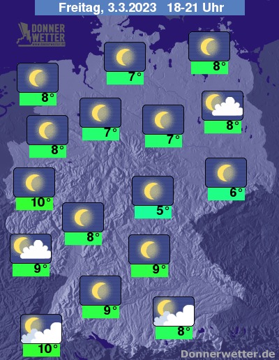 Heute Abend zeigt sich der Himmel über dem Land verbreitet sternenklar, hier und da sind einige Wolken möglich. Direkt an den Alpen ist es auch teils stark bewölkt, dazu bleibt es trocken. Die Temperatur liegt bei 5 Grad in Erfurt und 10 Grad in Bonn.