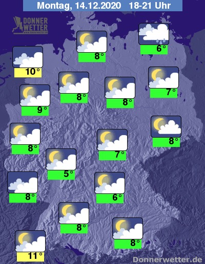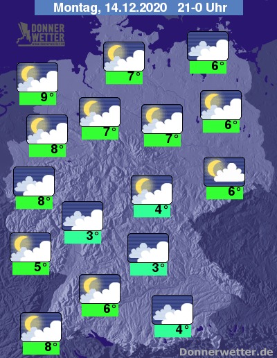 Die Temperaturen gehen zum späten Abend hin auf Werte um 9 Grad in Ostfriesland und um 3 Grad im Altmühltal zurück.