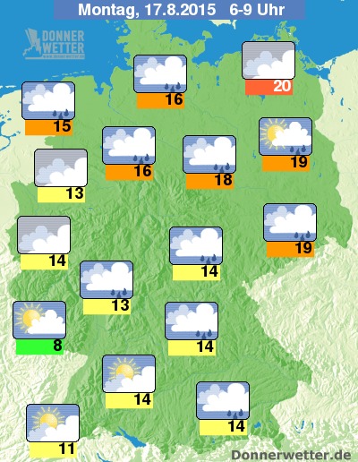 In der Nordhälfte sowie im Westen und entlang der Mittelgebirge sollte am Montag auf dem Weg zur Arbeit der Schirm nicht fehlen. Freundlicher zeigt sich dann nur der äußerste Südwesten des Landes. Die Temperaturen liegen am Morgen bei Höchstwerten um 8 bis 20 Grad C.