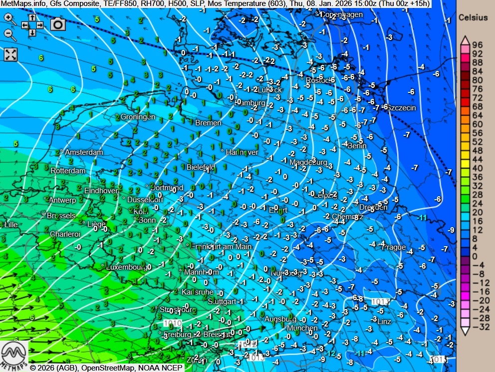 Die Temperaturen liegen am Nachmittag bei Werten um -5 Grad im Nordosten und +5 Grad am Oberrhein.