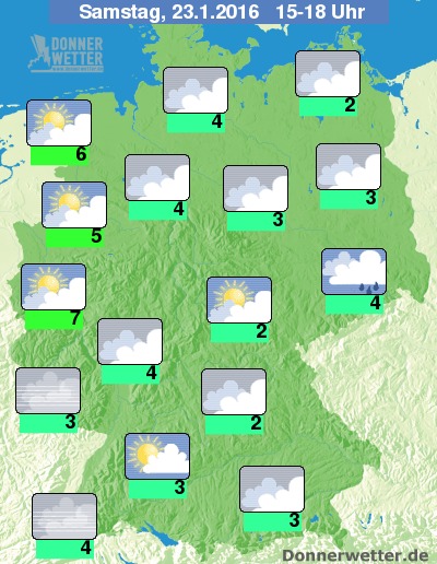 Am Sonntag weitgehend dichte Wolken, anfangs trocken, im Norden und Westen, später auch im Osten aufziehender Regen, im Süden weitgehend trocken, 2 bis 6 Grad.