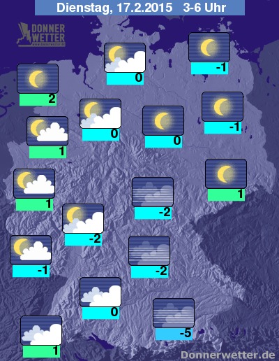 In der bevorstehenden Nacht bleibt es in der Osthälfte des Landes meist sternenklar, vor allem nach Süden hin kann sich jedoch Nebel oder Hochnebel bilden. Weiter nach Westen ziehen zeitweise auch dichtere Wolken durch, oft ist es hier aber auch nur locker bewölkt und dazu bleibt es trocken. Die Temperatur sinkt auf 2 Grad an der Wesermündung und auf etwa -5 Grad im Alpenvorland.