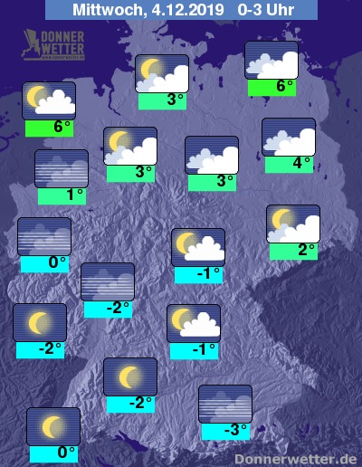 In der Nacht auf Mittwoch zeigt sich der Himmel im Norden und Osten des Landes zunächst noch wechselnd oder stark bewölkt; im weiteren Verlauf kann der Himmel dann, wie bereits auch im Süden und Westen, vielerorts aufklaren oder es bildet sich Nebel. Schauer sind in der Nacht nicht zu erwarten.