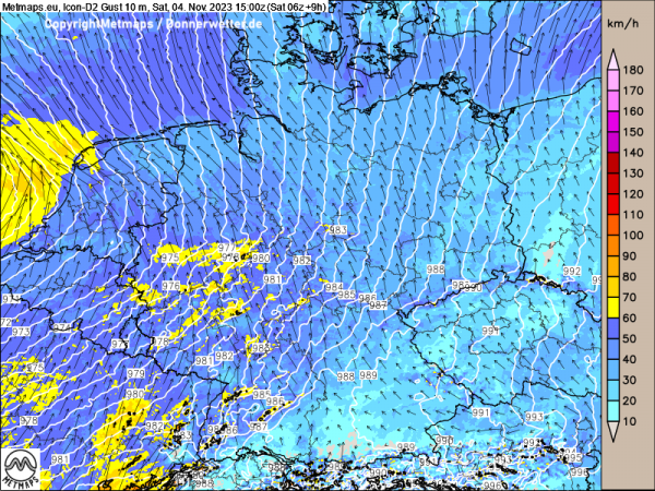 Es weht ein mäßiger bis frischer, im Westen auch stürmischer Wind aus Süd.  Die Karte zeigt die zu erwartenden Spitzenböen um 15 Uhr