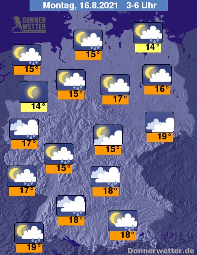 In der Nacht zum Montag ziehen zeitweise dichte Wolken durch, dabei können sich einzelne Schauer, selten auch Gewitter bilden. Sonst ist es auch oft locker bis aufgelockert bewölkt, teils auch sternenklar, dazu bleibt es trocken. Die Temperatur sinkt auf 19 Grad im Breisgau und bis 14 Grad im Münsterland.