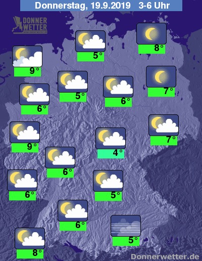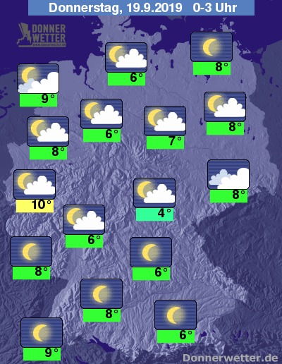 In der Nacht zeigt sich der Himmel über der Nordhälfte des Landes überwiegend locker bewölkt, nur an der Nordseeküste und in der Lausitz können die Wolken zeitweise auch dichter sein. Im Süden funkeln zunächst noch häufig die Sterne von einem meist wolkenlosen Himmel, in den frühen Morgenstunden überwiegen dann aber auch hier lockere Wolken am Himmel. Schauer sind in der Nacht nicht zu erwarten.
