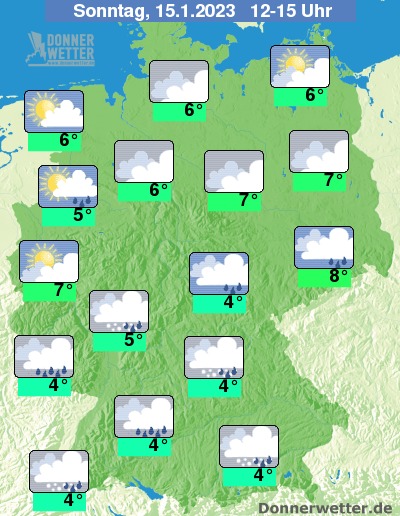 Heute Nachmittag zieht häufig starke, teils auch aufgelockerte Bewölkung durch, dabei bilden sich gebietsweise Schauer, die zum Teil auch als Schnee oder Schneeregen niedergehen können. Die Temperatur liegt bei 4 Grad in Mittelfranken und etwa 8 Grad in der Lausitz. Vor allem über der Nordhälfte weht ein verbreitet stürmischer Wind, an der See und auf den Bergen herrscht teilweise schwerer Sturm.