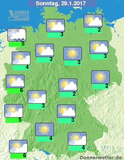 Heute ist es über der Südosthälfte Deutschlands verbreitet heiter bis sonnig und dazu trocken. Im Norden und Westen ziehen dagegen gebietsweise auch einige Wolken durch. Oft dichte Wolken ziehen vom Emsland bis zum Nordseeumfeld hin auf, hier fällt auch zum Teil Regen, sonst bleibt es hingegen trocken. Die Temperatur erreicht 2 bis 6 Grad.