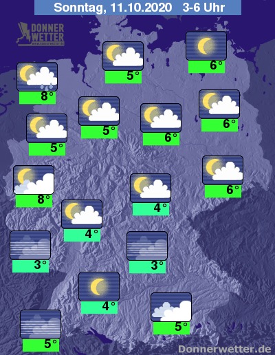 In der kommenden Nacht zeigt sich der Himmel über dem Land verbreitet sternenklar oder nur locker bewölkt. Dichte Wolken ziehen jedoch besonders über den Nordwesten, teils auch über den Norden und Westen hinweg, dabei ist gebietsweise auch Regen möglich, sonst bleibt es trocken. Die Temperatur sinkt auf 8 Grad in Düsseldorf und bis 3 Grad in Nürnberg.