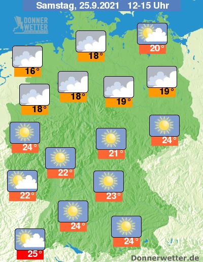 Heute Nachmittag halten sich über dem Norden mehrheitlich dichte Wolken, nur hier und da lockert es auch mal etwas auf. Weiter nach Süden hin herrscht hingegen verbreitet heiteres bis sonniges Spätsommerwetter. Es bleibt überall trocken bei Werten von 16 Grad an der Nordsee und etwa 25 Grad im Breisgau.