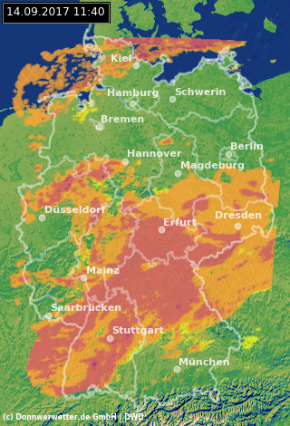 Am Nachmittag zeigt sich der Himmel meist dicht bewölkt oder bedeckt, einzelne Lichtblicke beschränken sich überwiegend auf die Nordwest-, später auf die Westhälfte. Mit Schauern muss verbreitet gerechnet werden, im Süden fällt regional auch ergiebiger Regen.