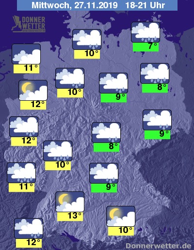 In den Abendstunden ist der Himmel meist dicht bewölkt oder bedeckt; im äußersten Nordwesten und an den Alpen, sowie am späteren Abend in der Osthälfte, kann es zeitweise auch auflockern. Wo die Wolken aufreißen, bleibt es meist trocken. In den übrigen Landesteilen muss immer wieder mit Schauern gerechnet werden. Im Westen weht ein frischer bis stürmischer Wind aus Südwest, sonst mäßiger bis frischer Wind.
