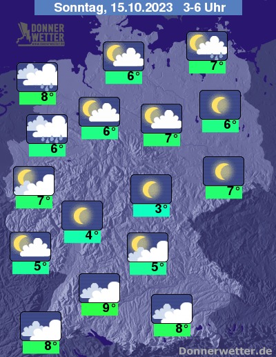 In der kommenden Nacht ist es am Alpenrand und an der See bedeckt. An den Alpen fällt etwas Regen, an der See bilden sich teils kräftige Schauer oder sogar einzelne Gewitter. Die Schauerfront bewegt sich bis zum Morgen auch in den übrigen Norden und den Westen des Landes, sonst bleibt es trocken. Die Temperatur sinkt auf 9 Grad in Stuttgart und 3 Grad in Erfurt.