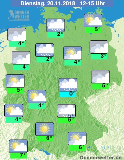Am frühen Nachmittag kann es über den nördlichen und östlichen Mittelgebigen zeitweise schneien auch über Niedersachsen tanzen stellenweise Flocken vom Himmel, in tiefen Lagen tröpfelt es zum Teil auch. Im übrigen Land wechseln sich kurze Aufheiterungen mit dichteren Wolken ab und nur vereinzelt fällt etwas Regen oder Schnee.