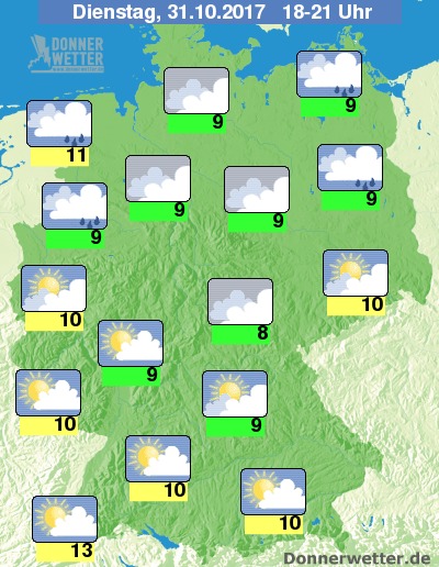 Heute Abend zeigt sich der Norden stark bewölkt und vor allem in Küstennähe fällt auch zeitweise Regen. Über der breiten Landesmitte ist es wechselnd bewölkt, oft auch heiter. Im Süden ist es mehrheitlich heiter bis sonnig. Es bleibt trocken bei 8 bis 13 Grad.