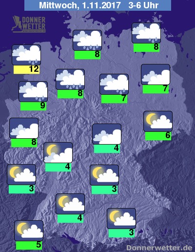 In der Nacht zum Mittwoch ziehen über den Norden kompakte Wolken mit zeitweiligem Regen hinweg. Über dem Süden ist es meist locker bewölkt und dazu trocken, sonst ist es oft aufgelockert, teils stark bewölkt und weitgehend trocken. Die Temperatur sinkt auf 12 bis 3 Grad.