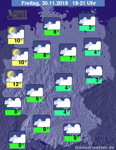 Die Temperaturen liegen am frühen Abend noch zwischen 3 Grad im Osten und milden 12 Grad im Westen.