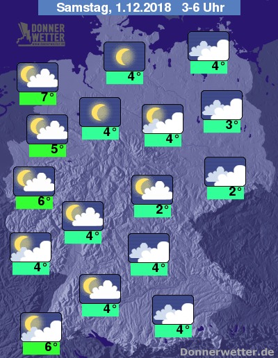 Während der zweiten Nachthälfte leuchten im Westen und in der Mitte gebietsweise Mond und Sterne, örtlich bilden sich Nebelfelder. Im Osten dominieren die Wolken, Regen fällt jedoch kaum noch.