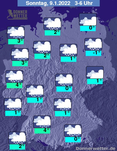 Am Sonntag ziehen überwiegend dichte Wolken durch, nur vereinzelt sind Auflockerungen möglich. Es fällt vielerorts Schnee, Schneeregen oder Regen. Die Temperatur erreicht 1 Grad im Thüringer Becken und bis 6 Grad an der Nordsee. An den Küsten ist es zudem verbreitet stürmisch.