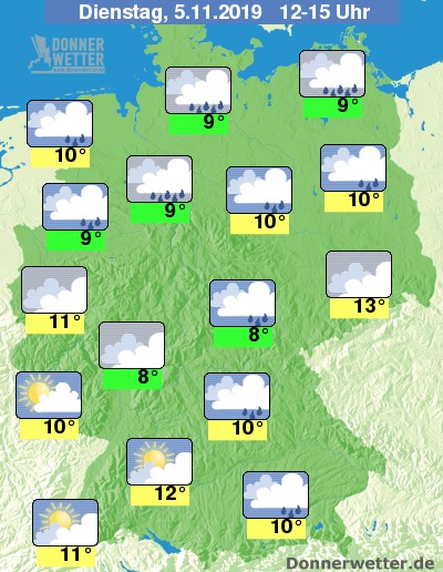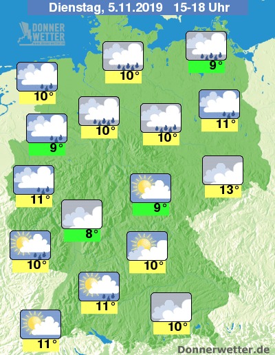 Bis zum frühen Abend schieben sich die Aufheiterungen von Südwesten weiter landeinwärts vor. Im Norden fällt weiterhin Regen, teilweise auch intensiver. Im übrigen Land trocknet es zunächst mal etwas ab, bevor sich im Südwesten und Westen örtliche Schauer ankündigen.