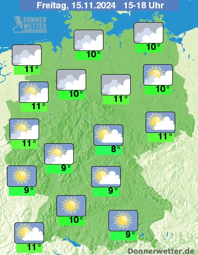 Die Temperaturen erreichen am Höchstwerte um 8 Grad in Oberfranken und 11 Grad am Oberrhein.