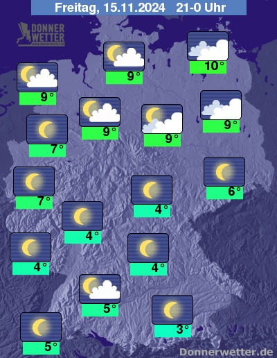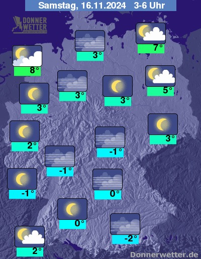 In der Nacht zum Samstag zeigt sich der Himmel über dem Norden und Nordosten stark bewölkt, es bleibt aber niederschlagsfrei. In den übrigen Landesteilen ist es zunächst sternenklar, in den frühen Morgenstunden kann sich dann lokal Nebel oder Hochnebel bilden.
