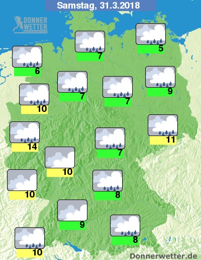 Am Samstag halten sich über Deutschland dichte Wolken, die besonders über der Nordosthälfte, jedoch auch gebietsweise im Süden und Westen Regen bringen. Die Temperatur steigt auf 5 Grad in Vorpommern und bis 14 Grad in der Kölner Bucht.