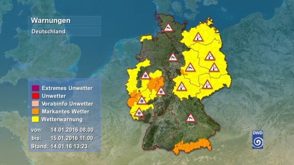 Nach der amtlichen Karte des Deutschen Wetterdienstes bestehen für weite Teile Deutschlands Wetterwarnungen. In den westlichen Landesteilen ist verbreitet mit Schneeglätte zu rechnen, aber auch sonst bleiben durch die aktuelle Wetterlage zahlreiche Wetterwarnungen aktiv. Temperaturen die oft um den Gefrierpunkt liegen verursachen in weiten Teilen Deutschlands überfrierende Nässe, zudem tritt insbesonders im Süden ein teils stürmischer Wind auf.