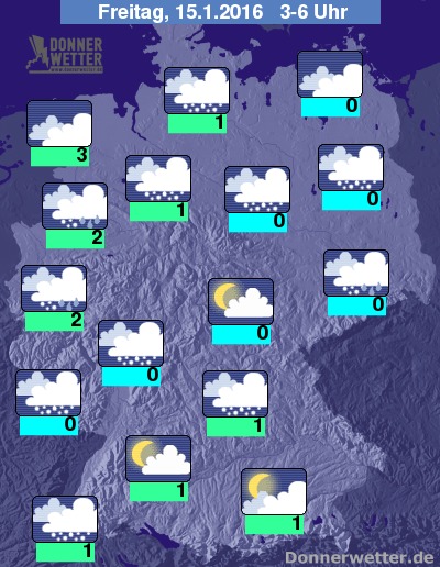 In der Nacht zum Freitag ziehen häufig dichte Wolken übers Land, die für zeitweilige Schneefälle sorgen, im Nordwesten und Westen fällt auch teils Regen oder Schneeregen. Vor allem über dem Süden und der Landesmitte lockert die Bewölkung auch gebietsweise auf. Es besteht verbreitet Glättegefahr! Die Temperatur sinkt auf 3 Grad an der Nordseeküste und bis 0 Grad in Dresden und Leipzig. Über der Südwesthälfte des Landes weht ein starker und teils auch stürmischer Wind.