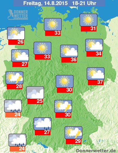 Die Höchstwerte liegen am Nachmittag bei Temperaturen 24 Grad C im Saarland und um 37 Grad C in der Sächsischen Schweiz.