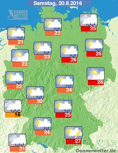 Am Samstag zeigen sich hier und da heitere und dazu trockene Abschnitte, häufig ziehen aber auch viele und oft dichte Wolken durch, die für zeitweiligen Regen oder Schauer sorgen. Lokal sind auch Gewitter zu erwarten. Gegen Abend heitert es im Nordwesten und im Westen verbreitet auf und es bleibt meist trocken. Die Temperatur steigt auf teils nur 16 Grad am Pfälzer Wald und bis 28 Grad in der Lausitz.