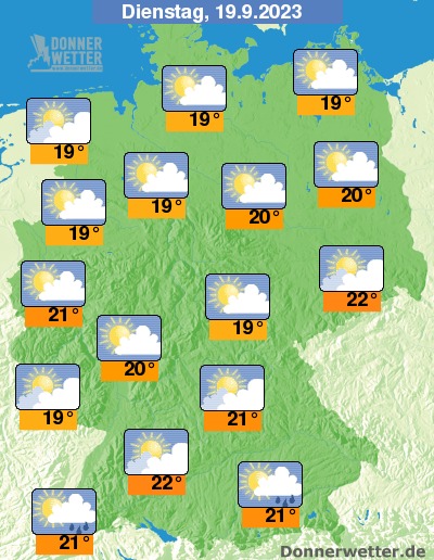 Am Dienstag zeigen sich zum Teil heitere Abschnitte, teilweise zieht aber auch starke Bewölkung durch. Im Süden und äußeren Norden sind dabei einzelne Schauer möglich, sonst bleibt es weitgehend trocken. Die Temperatur erreicht 19 Grad in Rostock und bis 22 Grad in Stuttgart.