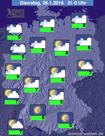Heute Abend zeigt sich der Himmel über dem Süden des Landes sternenklar oder leicht bewölkt, dazu bleibt es hier trocken. Von Nordwesten ziehen dagegen dichte Wolken und Regen auf, der sich bis Mitternacht etwa über die Nordwesthälfte des Landes hin ausbreitet. Im übrigen Bundesgebiet bleibt es bei wechselnder bis starker Bewölkung weitgehend trocken. Die Abendtemperatur liegt bei 9 Grad in Hannover und um 5 Grad in Mittelfranken. Im Norden und Westen weht ein zunehmend starker bis stürmischer Wind, auf den Bergen und an der See sind Sturmböen möglich.