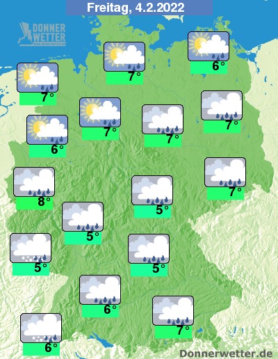 Am Freitag ziehen von Nordwesten her häufig dichte Wolken durch, die auch zeitweise Regen bringen. Vor allem am Nachmittag zeigt sich im Norden und Westen aber auch vielerorts die Sonne. Die Temperatur steigt auf 5 Grad in Nürnberg und bis 8 Grad in der Kölner Bucht. An den Küsten weht ein stürmischer Wind.