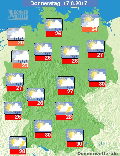 Am Donnerstag ist es in den östlichen Landesteilen zunächst noch oft heiter bis aufgelockert bewölkt und trocken. Von Westen ziehen jedoch schon zu Tagesbeginn dichte Wolken auf, die nachfolgend verbreitet Schauer und auch mögliche Gewitter bringen. Die Temperatur steigt auf 20 Grad im nördlichen Emsland und bis 30 Grad in Stuttgart.
