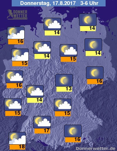 In der bevortstehenden Nacht sind über dem Alpenvorland anfangs noch einige, teils dichte Wolken unterwegs, die hier jedoch kaum noch Schauer bringen, sonst ist der Himmel vor allem im Norden und Osten überwiegend sternenklar und im übrigen Bundesgebiet locker bewölkt, dabei bleibt es trocken. Die Temperatur sinkt auf milde 18 Grad im Breisgau und bis etwa 13 Grad im Grabfeld.