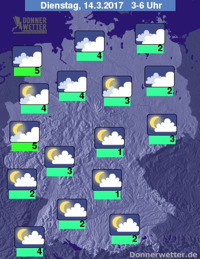 In der folgenden Nacht ist es im Norden oft stark, teils aufgelockert, über der breiten Landesmitte meist leicht bis aufgelockert und im Süden meist nur locker bewölkt, dabei bleibt es landesweit trocken. Die Temperatur sinkt auf 5 Grad in Emden und bis 1 Grad in Unterfranken.